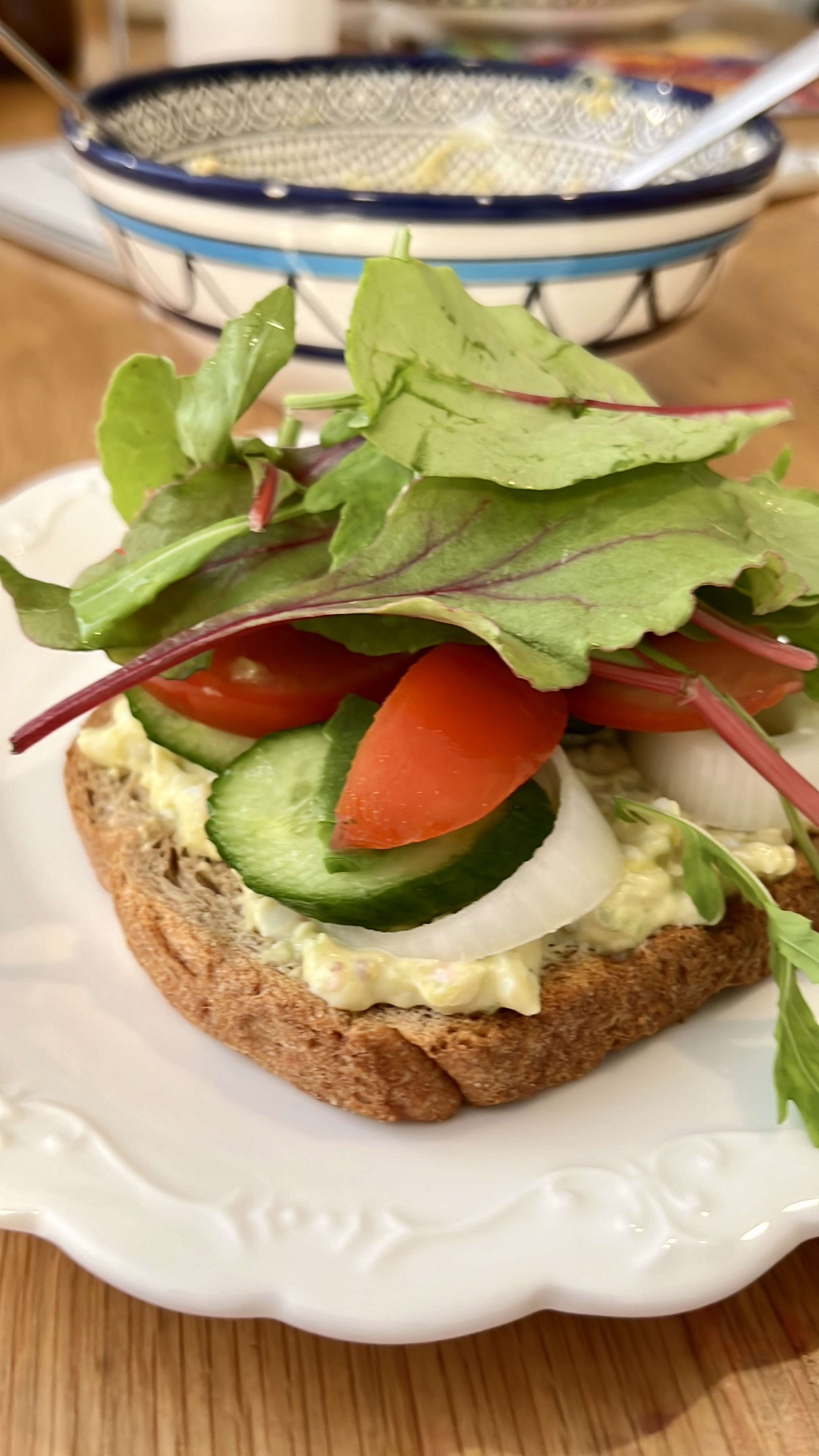 - ندهن خبز بسلطة الافوكادو ونضيف خضراوات نرغبها على الوجة ..